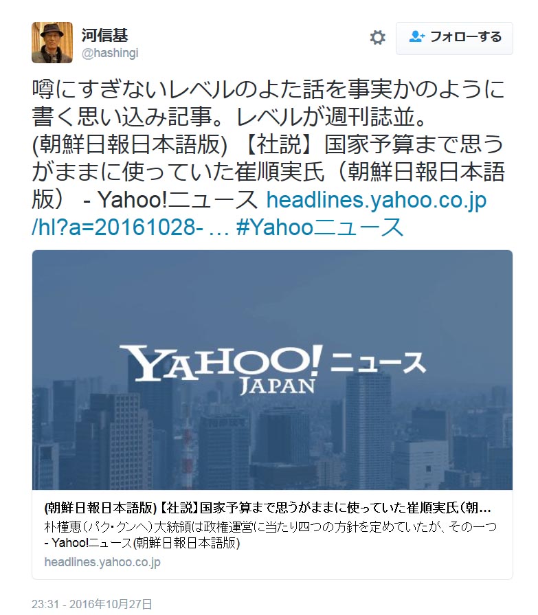 浅井基文氏の上記最新記事によると、韓国のハンギョレ統一文化財団主催のシンポジウムで「韓国核武装」という主張が当たり前のように飛び交っていてショックを受けたとの事です。が、浅井氏に申し上げておきたいのですが、筆者はこれを見て「ああ、やっぱりね」という感想しかなく、まさに(嫌な)予感通りという印象でした。これまで筆者は何度も指摘してきましたが、韓国のハンギョレ新聞(のみならず京郷新聞、オーマイニュース、プレシアンといった韓国の著名な進歩派というかリベラル系メディア達)というのは諸外国で思われているほど素晴らしくもなければ、反権力でも反骨派でもありません(創刊間もない頃の最初期はどうだったか知りませんが)。一言で言うと、ただの煽情報道と機会主義で部数を稼ぐ事が最優先の堕落し切ったダボハゼメディアです。日本で言えば、最近なら旧噂の真相スタッフが主軸になっているらしいリテラ(その実態は、貧困女子高生バッシング報道で捏造記事を出したビジネスジャーナルの別働隊)だとか、あるいは総会屋雑誌そのものであるかつての現代の眼なんかが非常に近いんじゃないでしょうか。最近の例で言うと、ハンギョレは朴槿恵政権の歴史教科書国定化に表向き反対の論陣を張りながら、裏では政府の国定教科書推進広告を一面トップに載せるなどという露骨な事もしています。ハンギョレの掲げる「社会正義」や「民主主義」や「歴史正義」など、広告を取る為のネタでしかありません。今のハンギョレに極右朴槿恵政権の悪事を真面目に追求しようとしている記者などほとんどいないでしょう。今韓国で大騒ぎになっている「崔順実事件」にした所で同様であり、今をときめくホットイシューだからスキャンダラスかつ煽情的に書き立てているだけで、その姿勢は朝鮮日報などとほとんど一緒です。ハンギョレの崔順実事件報道に核心を突くような鋭い記事や分析はほとんどありません。対日問題についてもそうで、この新聞は日本の安保法案(戦争法)成立に対して「対北抑止力になるから評価出来る」などという、およそ日帝の植民地被害国の、それも「代表的進歩派新聞」とはとても思えない無茶苦茶な社説まで乗せていました。明仁を「平和の神」のごとくヨイショするのにも率先していますし…。